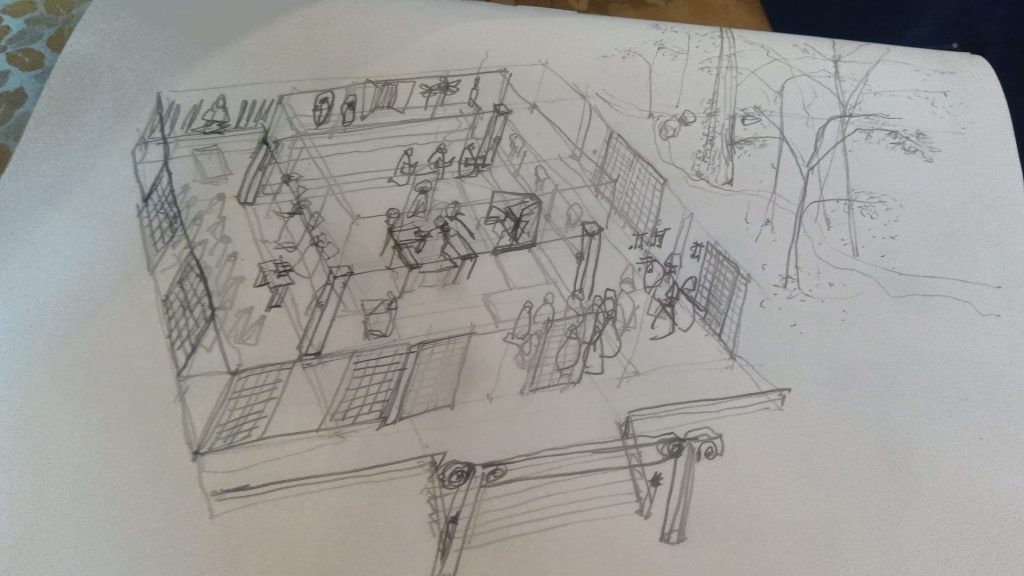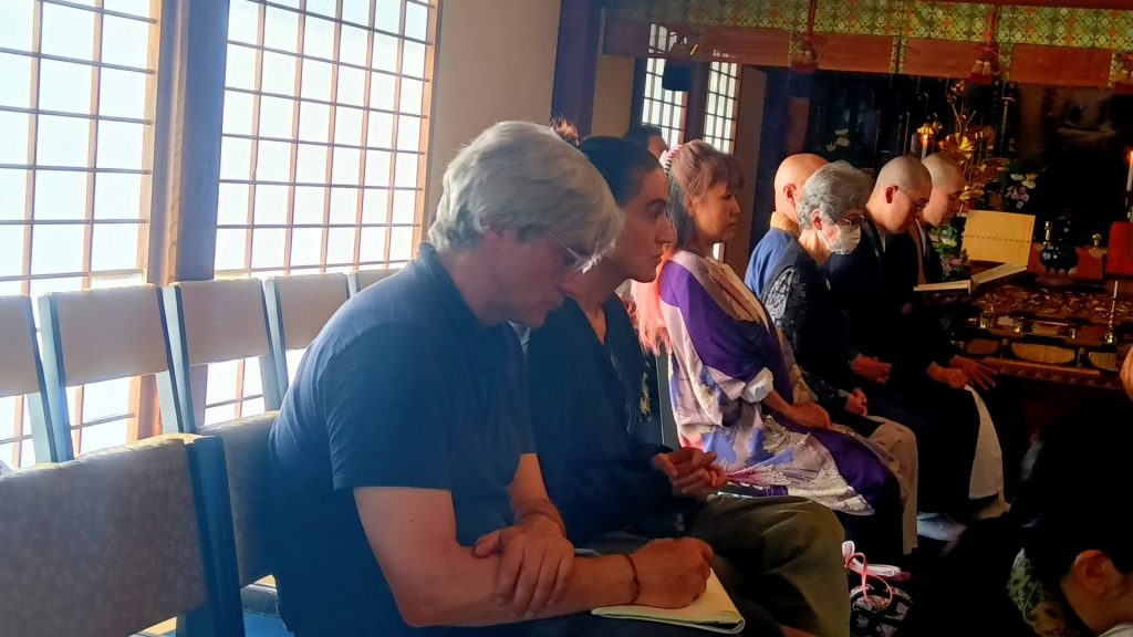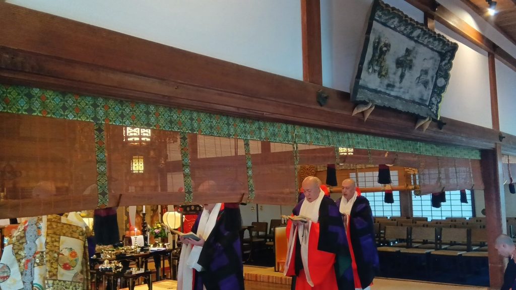 建築家の夫は、「この空間を、脳裏に焼き付けたいから」と、スケッチブックを取り出し、法要が営まれた宸殿の様子をスケッチした。三千院の宸殿(しんでん)は、京都御所の紫宸殿を模している。