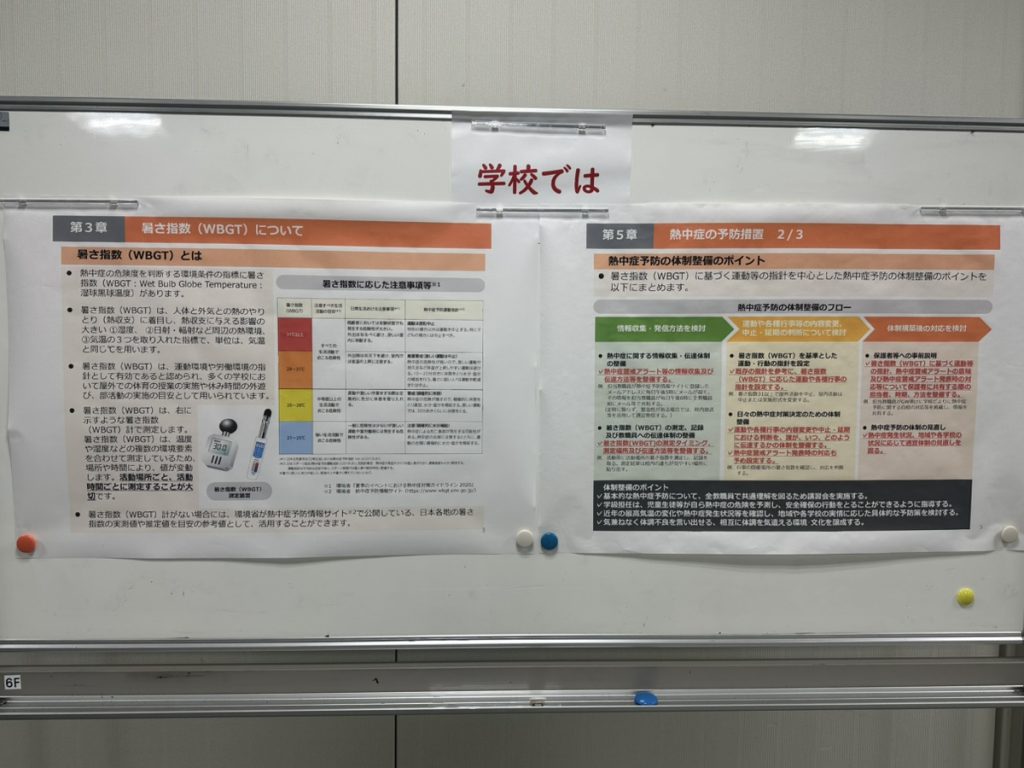 体育や行事、部活動などの場面では、暑さ指数を使った判断や、こまめな水分補給、児童・生徒が体調不良を申し出やすい雰囲気づくりなどが重要とされています。