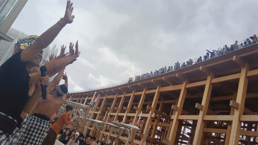 万博会場のシンボル「大屋根リング」沿いのパビリオン。リングの上にも人だかりができ、迫力の中に、どこか愛嬌のある男性たちの表情を楽しんだ。