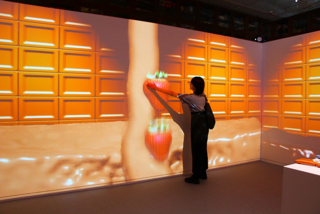 「不思議なチョコレート劇場~メタモルフォーゼ映像を体験しよう!遊ぼう!~」は別室で開催。デジタルアートのクリエイティブ集団「Switch(スイッチ)」が制作したインタラクティブ作品で、壁に映し出された映像に触れると、紙吹雪とともにチョコレートが跳ねたり、滝のように流れ落ちるチョコの中からイチゴが現れるなど、チョコレート好きにはたまらない展開が続く。部屋の中央に置いてある6つのパッケージごとに映像が異なり、小さな子どもから大人まで、時間を忘れて楽しめる仕掛けが満載だ。