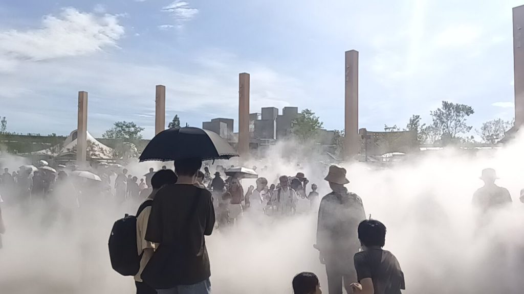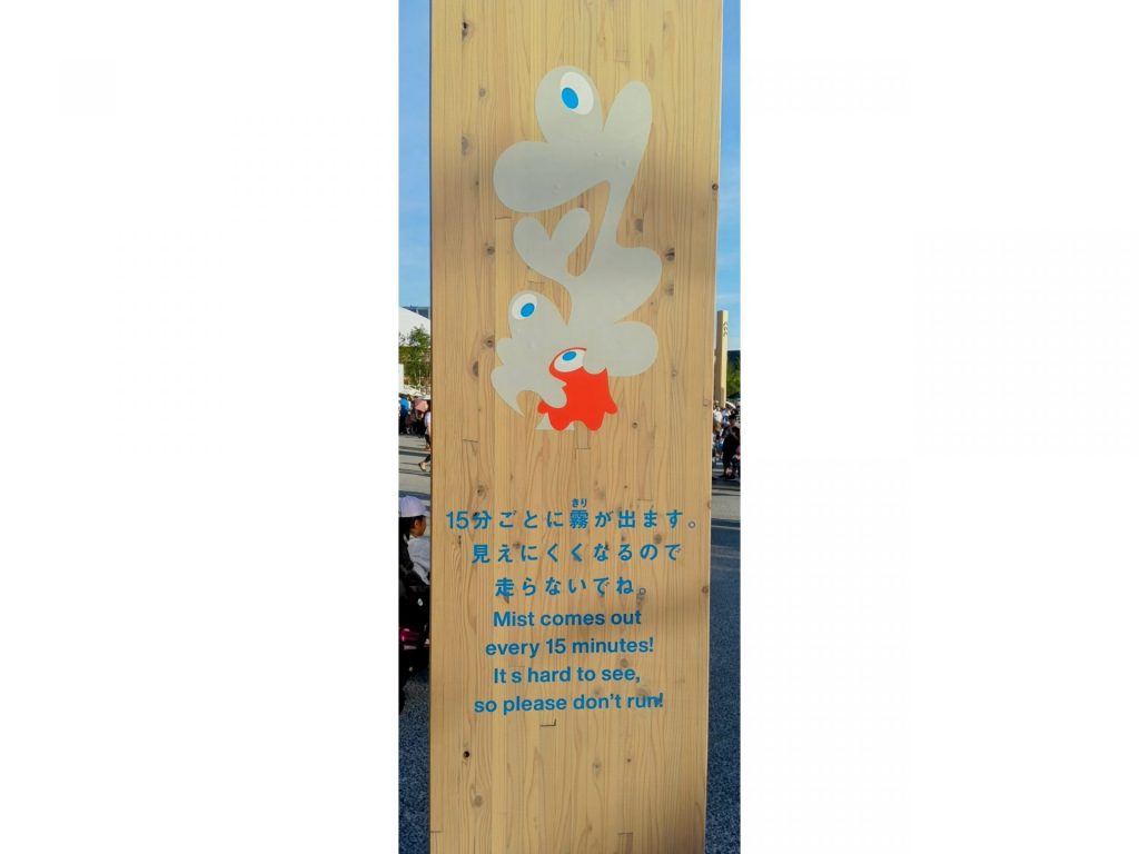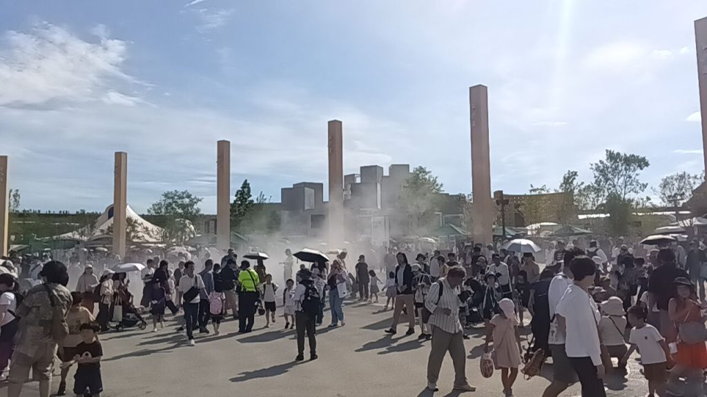 シグネチャーパビリオンが集まる中心部「いのちパーク」では15分に1度、地面から大量のミストが吹き出し、来場者は束の間の“涼”を感じてリフレッシュしていた。