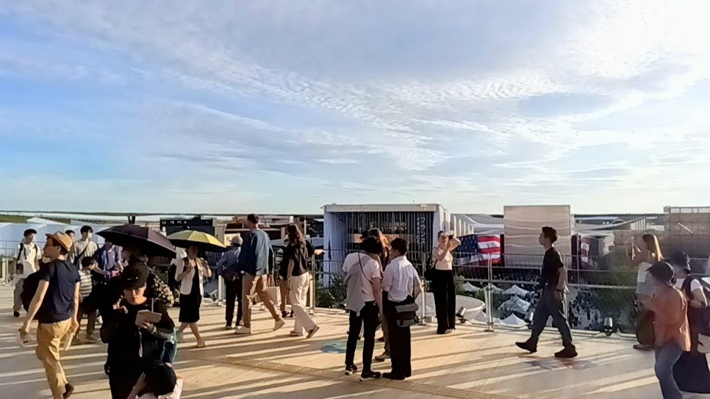 会場・夢洲では、マイボトルを持参すれば無料で給水できるウオーターサーバーなどを計80台設置している。6月に入り、日傘をさして、強い陽射しをさえぎる姿も目立つ。