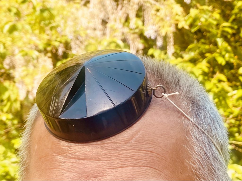 「もともとは頭全体をすっぽり覆うような大きなもんやったんですが、江戸時代以降にどんどん小型化していき、現在のような大きさになりました。このサイズですから普通の帽子のようにはいかず、頭に直射日光が当たってしまいますが、険しい山に入るときには前方にある木の枝などから頭を守ってくれるんです。ちょうどおでこの上あたりは枝が当たるところなんで、そんなときにこの頭襟が帽子のように守ってくれることがあります」(山伏さん)