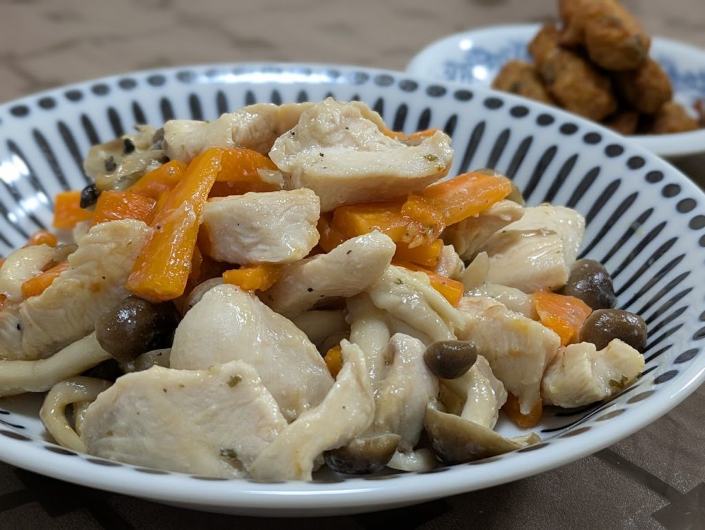 アレンジとして、電子レンジで下ゆでしたにんじんとしめじを追加してみました。