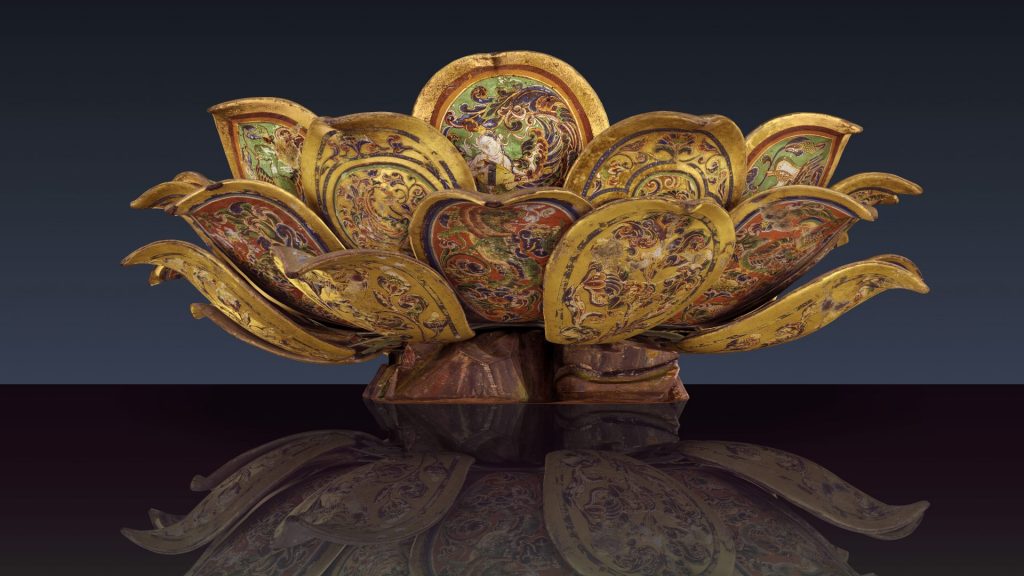 今展ではその中から11点を展示。さらに優品を360度からスキャンした高精細な3Dデジタルデータに演出を加え、映像作品として幅約20メートルの大スクリーンで上映している。これまでの展覧会や図録などでは分からなかった、造形の微細な箇所がはっきりと見え、質感までリアルに感じられる。宝物の映像のほかにも、聖武天皇と光明皇后の絆を描いたもの、宝物に施された文様や意匠が幻想的に登場するものなど、多彩な動画が壮麗な音楽とともに映し出され、正倉院宝物に宿る美と愛の世界が華やかに展開する。