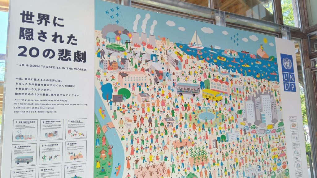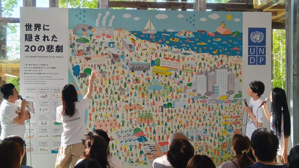 作品『世界に隠された20の悲劇』はタテ約4メートル、ヨコ約5メートルのボードに描かれたタペストリーで、戦争・紛争の長期化、人身売買、学校でのいじめなど20種類の課題について問題提起している。