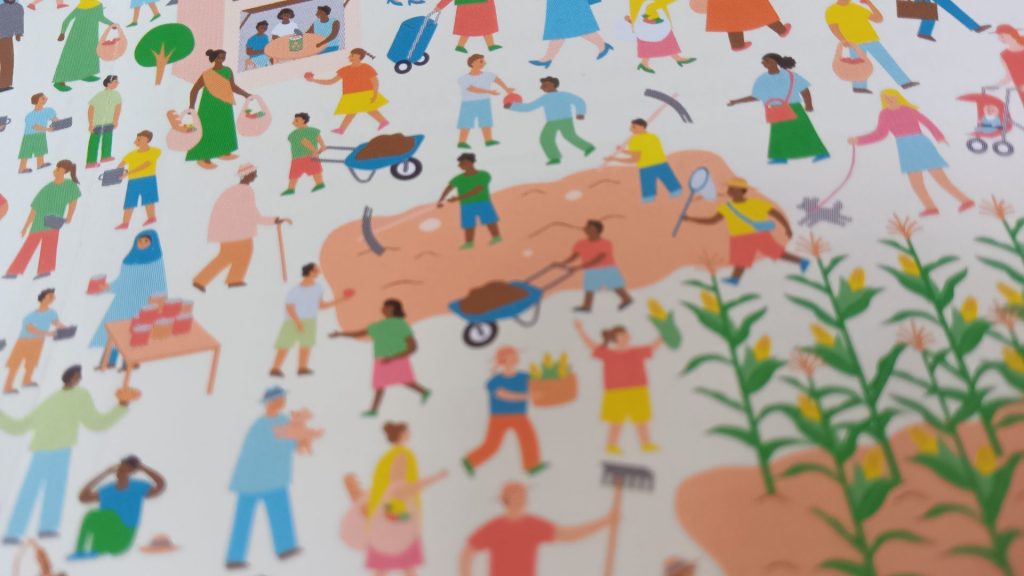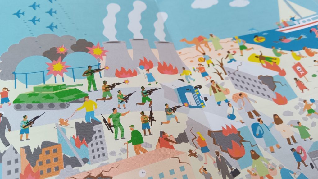 国連開発計画(UNDP)が作成した絵画のタペストリーだ。カラフルで明るく描かれた人々の営みの中に、爆撃を受ける工場、バスで人々が連れ去られる様子が描かれている。