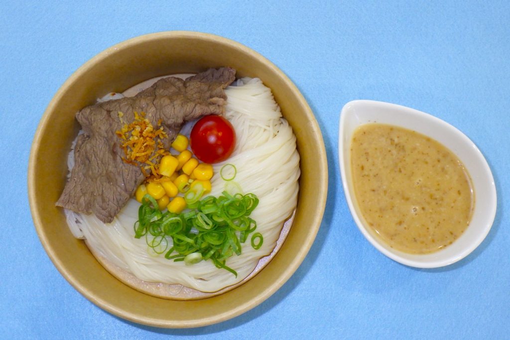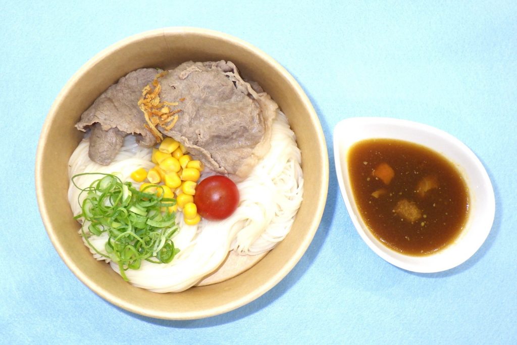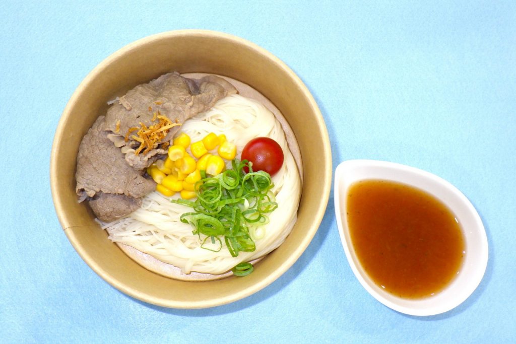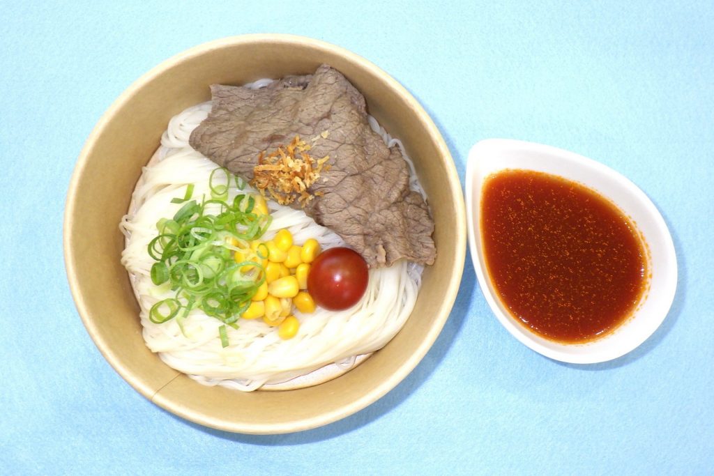 そうめん専用の熟成保管倉庫で2年間じっくりと寝かせて味わいを増した、レミアムな「揖保乃糸」特級品に、神戸ビーフや淡路島産フライドオニオンなどの食材をトッピング。