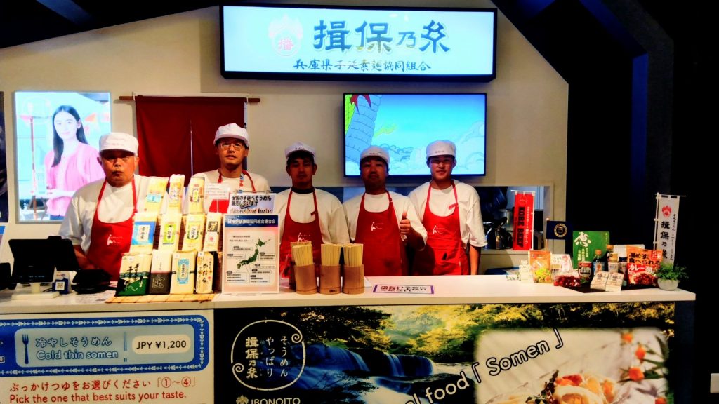 兵庫県産食材をふんだんに使用し、4種類のかけつゆ(ゴマ、 梅、トマト、カレー)から選べる冷やしそうめん・万博特別メニューや、全国の手延べ商品の物販を行う。