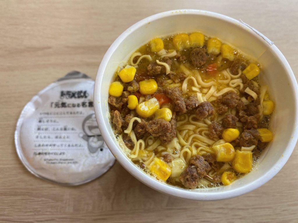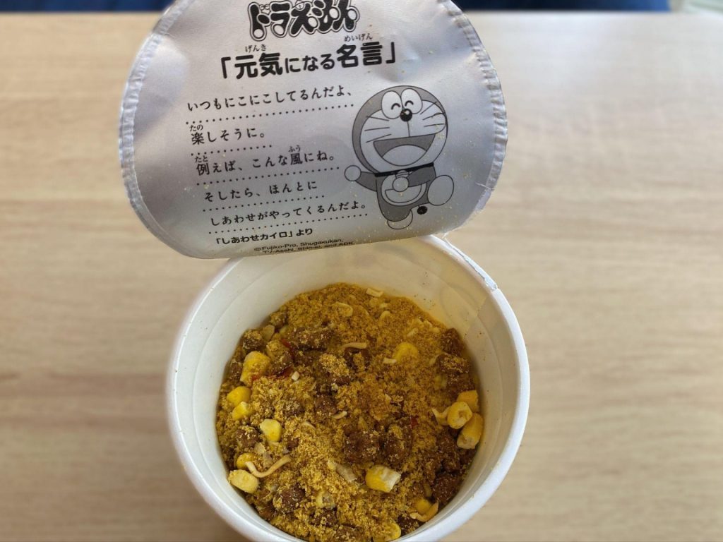 フタを開けると、鮮やかな黄色いスープが目に飛び込んできます。フタ裏には、ドラえもんの「元気になる名言」が印刷されているのを発見!