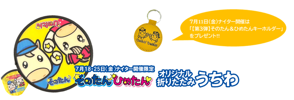 「そのだ金曜ナイター」開催日にあたる7月の金曜日に、園田競馬場内の売店で500円以上の買い物をすると、「そのたん&ひめたん」オリジナルグッズが配布されます。(※500円以上も、1000円以上も、配布は1つ)