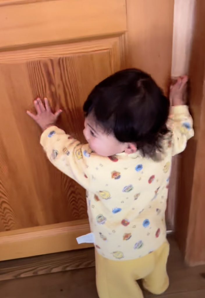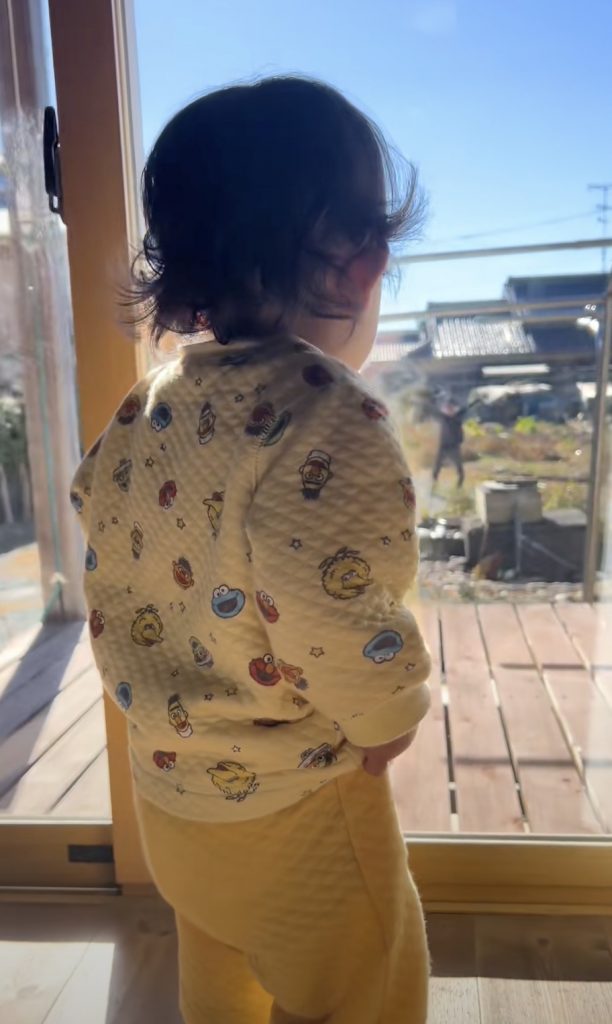 ママと2人でじぃじの家にお泊まりに行っていたこはちゃん。ちょうどそのタイミングで、パパが体調を崩してしまい、5日間会えない日々が続きました。体調が戻ってじぃじの家にパパがやってきた朝、ママとじぃじの「あっ!誰かが歩いてきたよ〜!誰かなぁ?」の声かけで外にいるパパに気づいたこはちゃん、大興奮です!