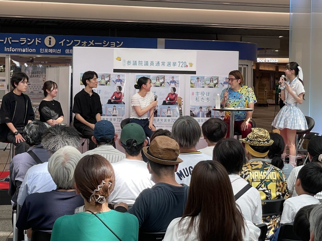 また、投票日1週間前の7月13日(日)、神戸市中央区の地下街「デュオこうべ」では、若い世代による選挙をテーマにした座談会が行われました。