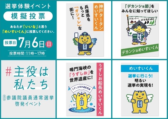 そのうち、7月6日(日)には、神戸市須磨区の神戸須磨シーワールド前で、選挙を体験できる模擬投票イベントが開催され、候補者となった4体のキャラクターに、親子連れなどが1票を投じていました。