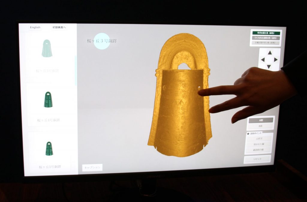 さらに、銅鐸の細部まで観察できる3D閲覧システムも初登場。銅鐸の精密な3Dデータが映った画面を操作すると、まるで手に取っているように角度を変えたり、実物では見ることができない内部まで確認できる。