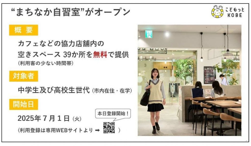 神戸市内に無料の自習スペース『まちなか自習室』誕生 中高生対象に7月から開始 2025/07/25 Prev 1/7 Next 記事を読む 関連記事 【写真】スマホで簡単登録! 学生のための無料自習スペース『まちなか自習室』の利用方法 2025/07/25 学校に行きづらさを感じる子どもたちへ 神戸市が進める学びの選択肢の拡充 2025/07/19 『共働き子育てしやすい街ランキング』1位の神戸市 支援充実の内容とは 担当者に聞く 2025/03/19 「ヤングケアラー」の声に寄り添う 神戸市の取り組み ケアラー同士の“つながる場所”とは 2025/04/25 中学校の部活動が変わる 神戸の地域クラブ活動「KOBE◆KATSU」 学区超えて自由に選択可能に 2025/05/08