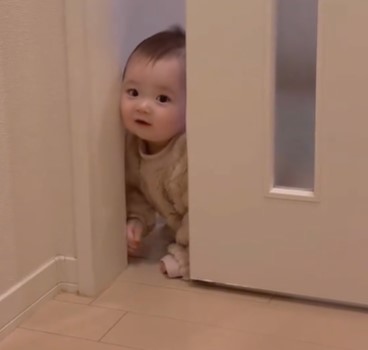 ママが「らなちゃん~!」と呼ぶと、ドアの向こう側からトントンとノックする姿の陰が…!ドアが開いた隙間からひょっこりと顔を出したのは、ママを見つけて嬉しそうな表情のらなちゃん。少し鼻の下を伸ばし、ママのもとへとハイハイで進もうとします。