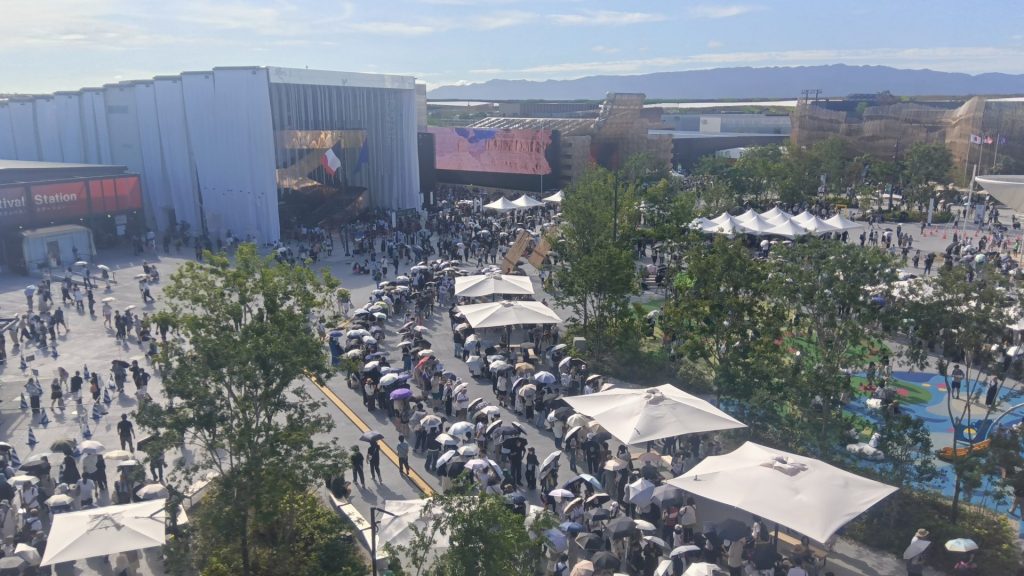 大阪府には津波注意報が発令されているが、会場・夢洲はかさ上げされており、予想される津波の高さよりも8メートル高くなっているため影響はないと判断。パビリオンは通常通り営業し、各イベントも予定通り開催する。