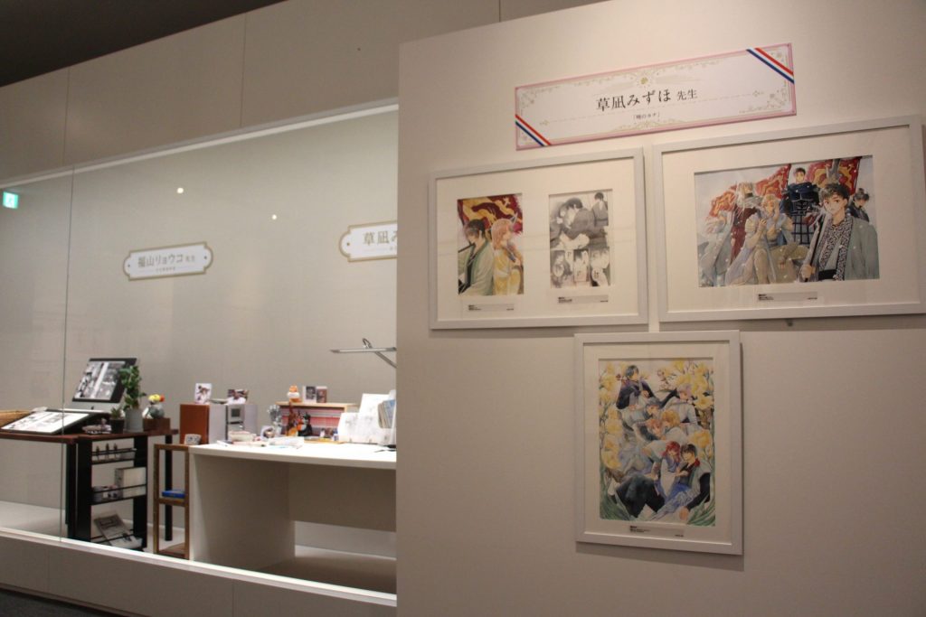 「暁のヨナ」(草凪みずほ)のイラスト(右)。左は草凪先生らの仕事場の再現