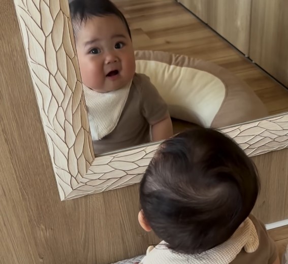 少し離れた場所で家事をしていたというママが赤ちゃんの様子を見に行くと、そこには鏡の中の自分を見つめる赤ちゃんの姿が。ママは思わず動画を撮影したそうです。鏡の目の前に座り、鏡に映る自分を不思議そうに眺める赤ちゃん。