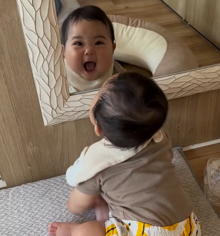 「鏡よ鏡…」映る自身に訴える生後7カ月の赤ちゃん→ママ見つけて満面の笑み「笑顔最高!!」 | ラジトピ ラジオ関西トピックス