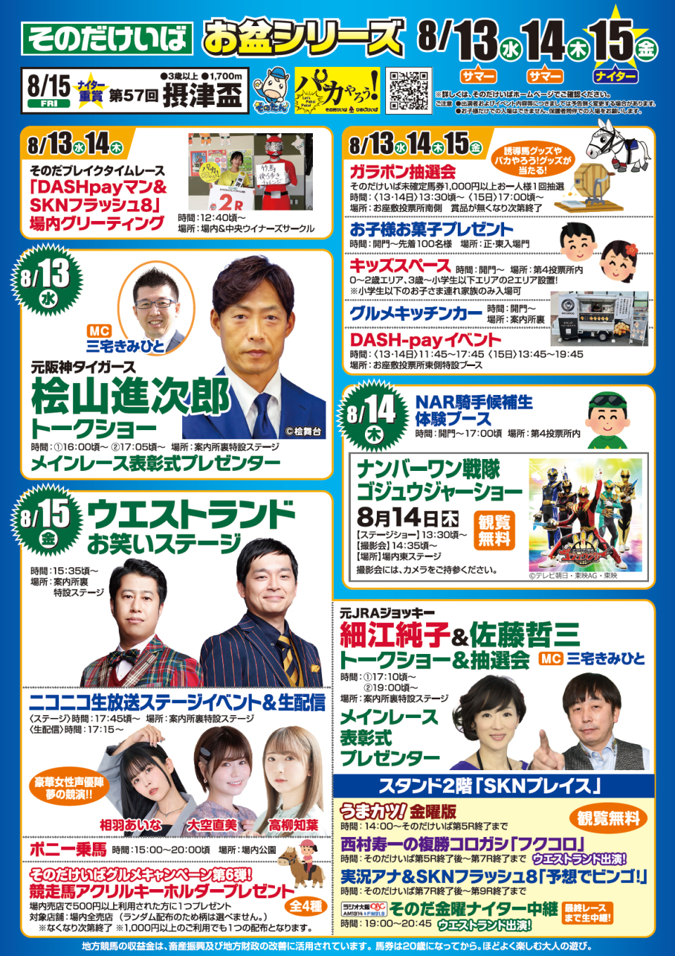 8月13日(水)から15日(金)まで園田競馬場(兵庫県尼崎市)で行われる、そのだけいばお盆シリーズのイベント概要が発表されています。