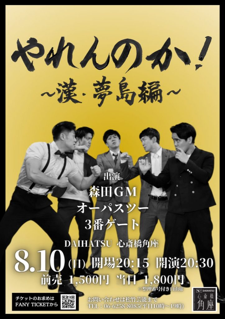 3番ゲートが出演するのは、8月10日(日)第2部の大谷マネージャープロデュースの『やれんのか!~漢・夢島編~』。ほかに、森田GMやオーパスツーなど注目の若手が出演するとのこと。