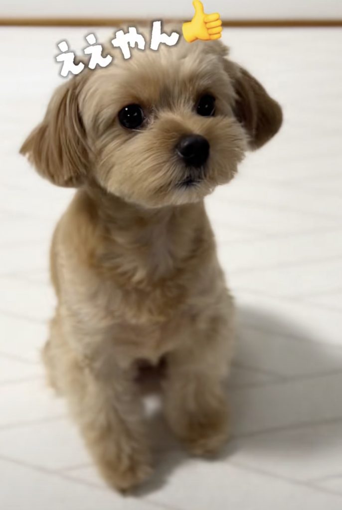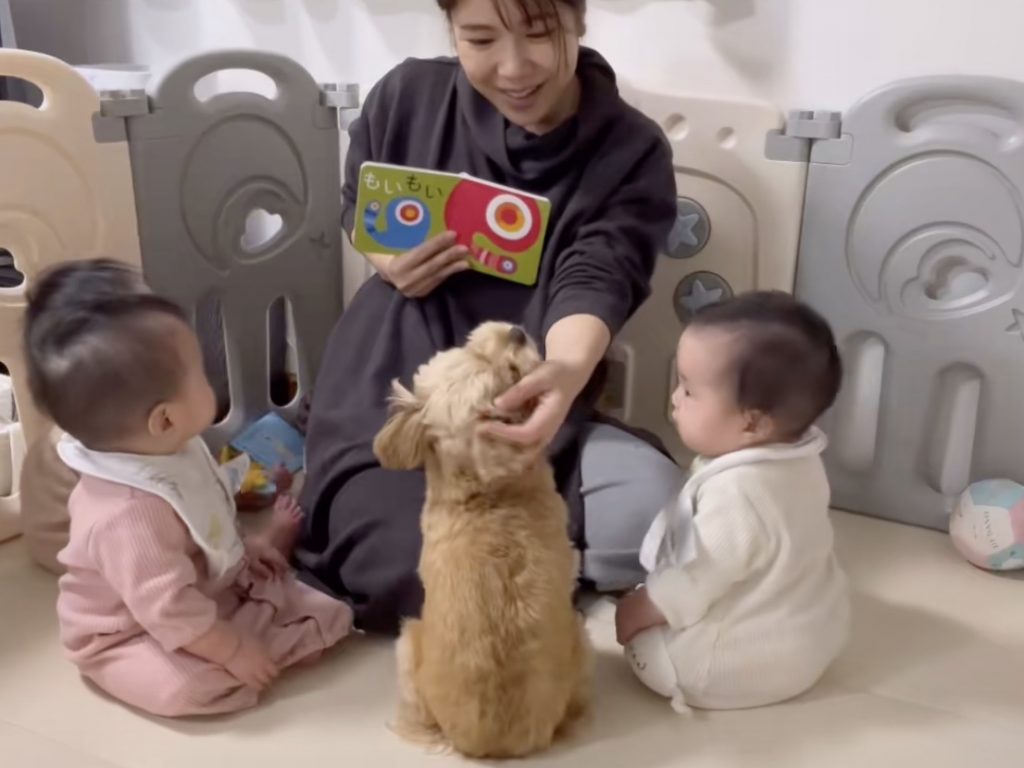 動画に出てくるのは、生後6カ月の三つ子の女の子たちと愛犬のたこやきちゃん。いつもは離れたところで、三つ子ちゃんが遊んでいるのをそっと見守っていることが多いたこやきちゃんですが、この日は絵本に好奇心が沸いたのか、近寄ってきて自ら三つ子ちゃんの間に座ったそう。