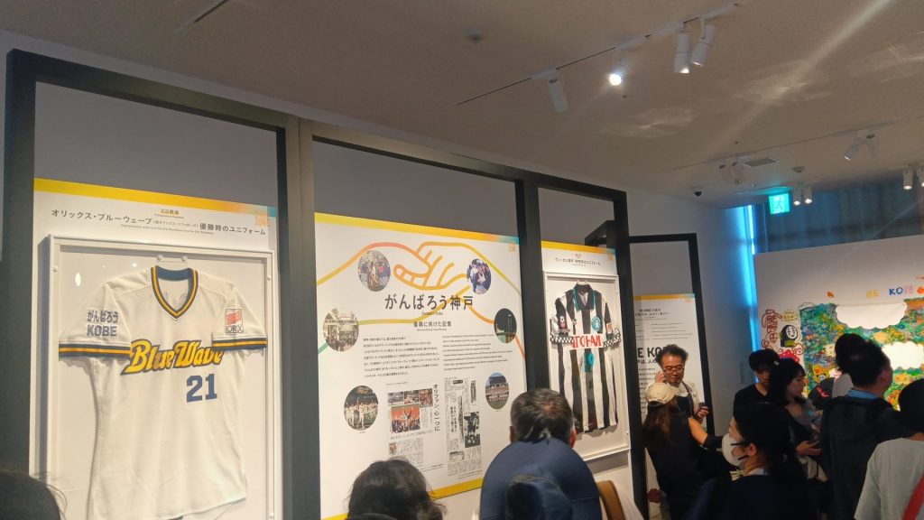 震災が起きた1995年、仰木彬監督のもと、イチローを擁し“がんばろうKOBE”のスローガンでリーグ優勝を果たしたプロ野球のオリックス・ブルーウェーブ(当時)や、サッカー・ヴィッセル神戸のユニフォームのほか、神戸港が開港した約150年前にイギリスで作られ、実際に着用されたドレス(神戸ファッション美術館蔵)、さらに「有馬かご」「有馬筆」などの伝統的工芸品も展示。