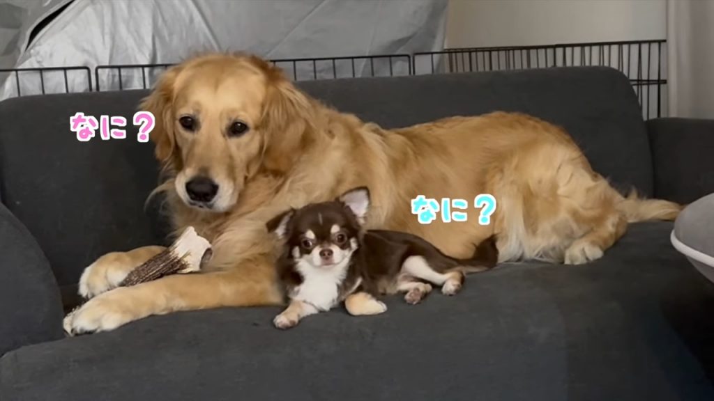 動画に出てくるのは、ゴールデンレトリバーのロイズちゃんとチワワのラオくん。リラックスした表情で座っている大きなロイズちゃんの上に、ちっちゃなラオくんがバランスを取りながら乗っています。