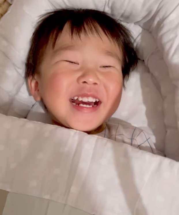 小さなクーファンの中にぴったりとはまり、その上にはキレイにかけられたかけ布団。両手も隠して、お顔だけが見えている姿はまさに大きな赤ちゃんです。ママが何度か「バブバブバブ??(赤ちゃん)」とあやすと、お兄ちゃんは嬉しそうに満面の笑みを見せます。