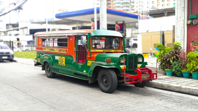 【ジプニー】フィリピンの乗り合いタクシー。中型トラックの荷台に椅子と屋根を取りつけ、乗車スペースにしている。ジプニーが運行しているルート上であれば、手を挙げたらすぐに止まってくれる。