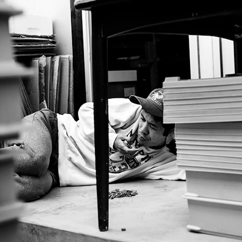 岡元さんは1978年生まれ。1996年に滋賀県甲賀市の福祉作業所「やまなみ工房」に入所した。人物や風景画など、雑誌や画集をモチーフに墨汁と割り箸1本だけを使って次々に作品を生み出している。床に寝転がり、音楽を聴きながら描くのが岡元さんのスタイル。全体像をとらえて描き、その線の上を何度も塗り重ねることで、飛び散る墨のしずくや擦れた線が、豊かな表情とエネルギーを注入し、力強い墨絵となる。