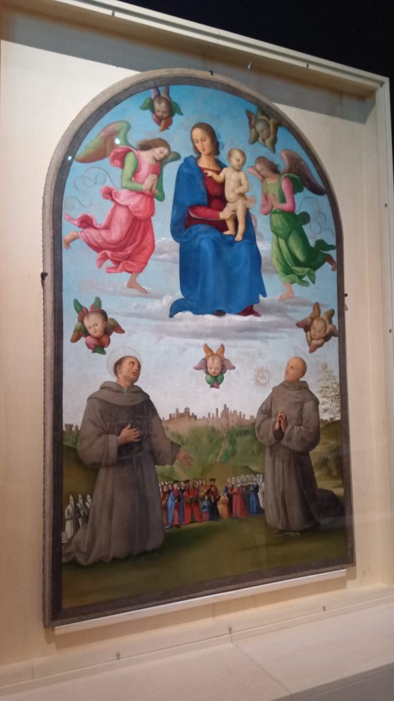 背景には、ペルージャ(ウンブリア州・州都)の街並みが描かれている。
