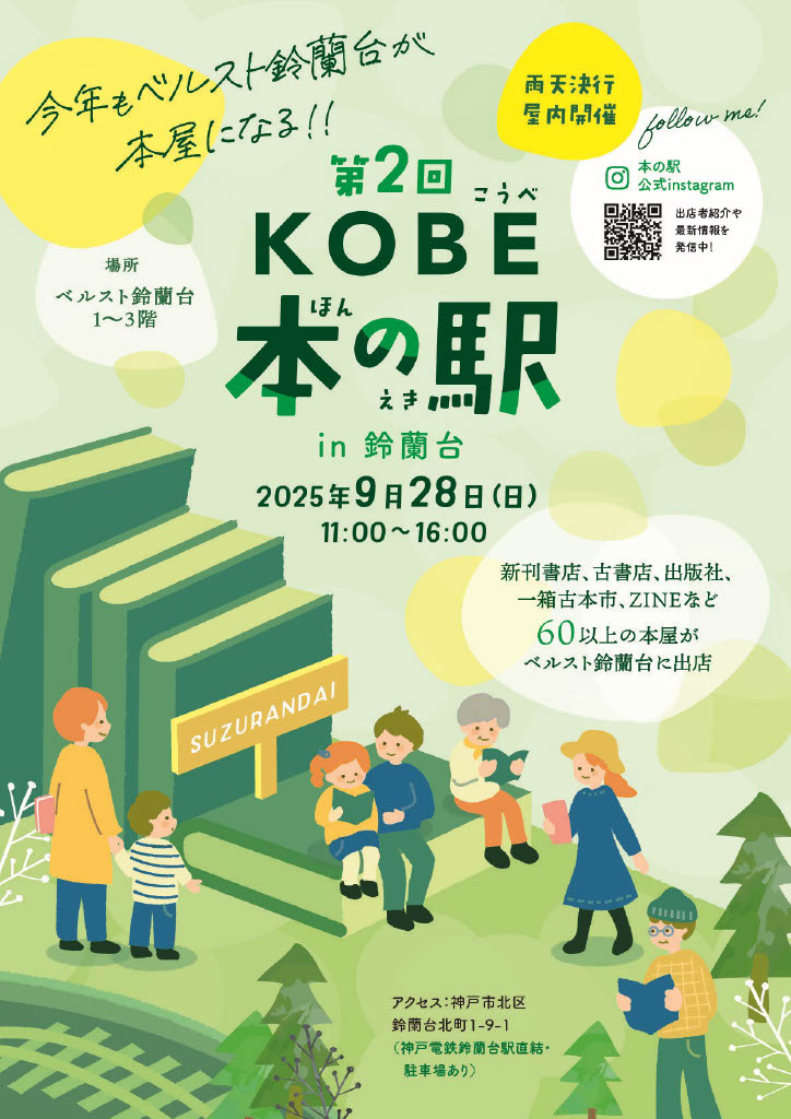 駅周辺に本屋がない神戸市北区鈴蘭台で、新刊書店・古書店など66の書店が一堂に集まる「第2回 KOBE 本の駅 in 鈴蘭台」が、2025年9月28日に開催される。