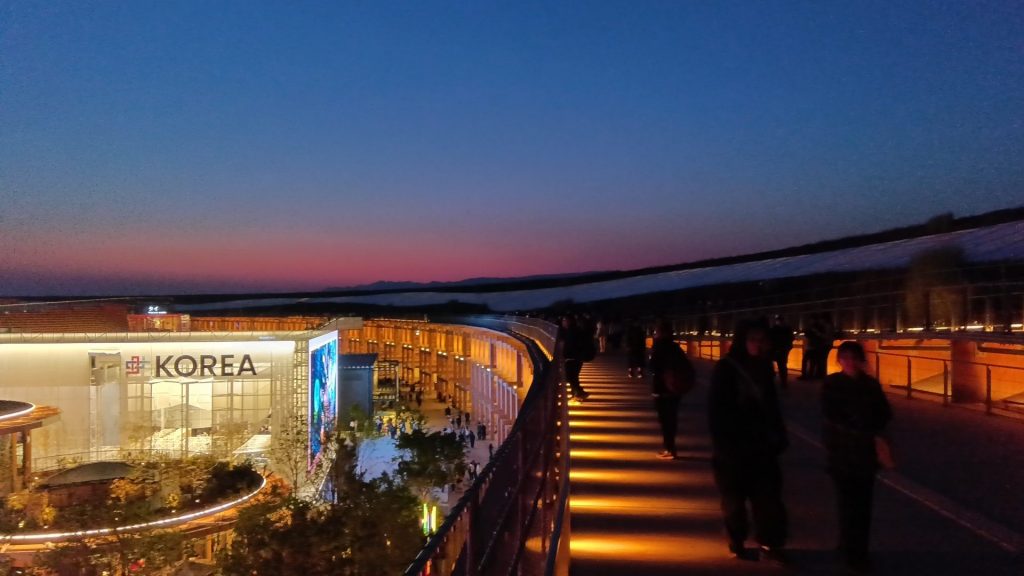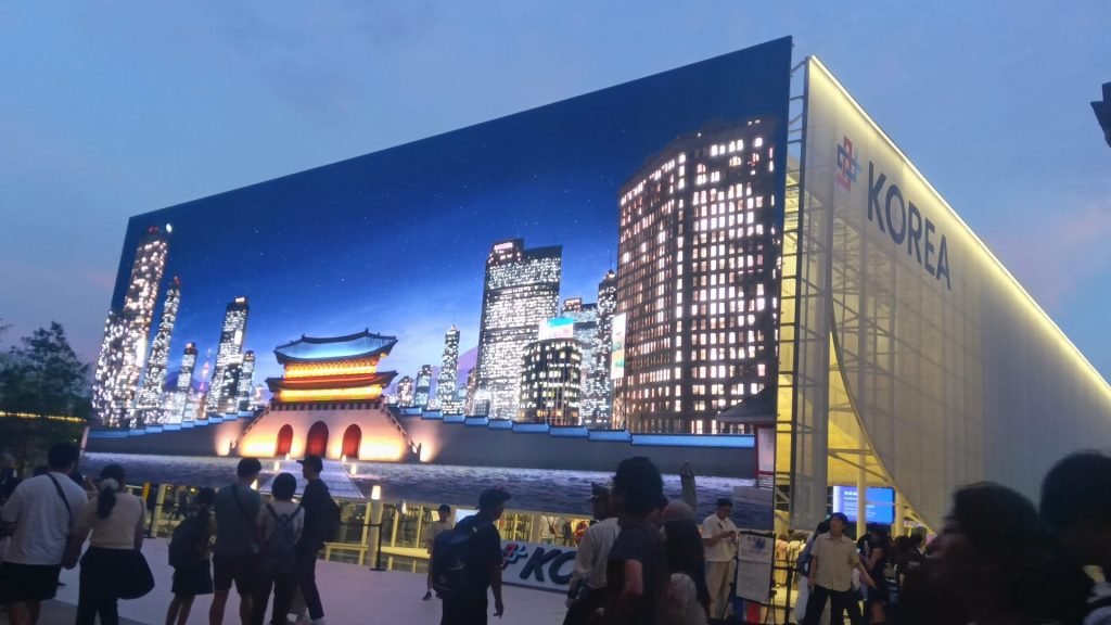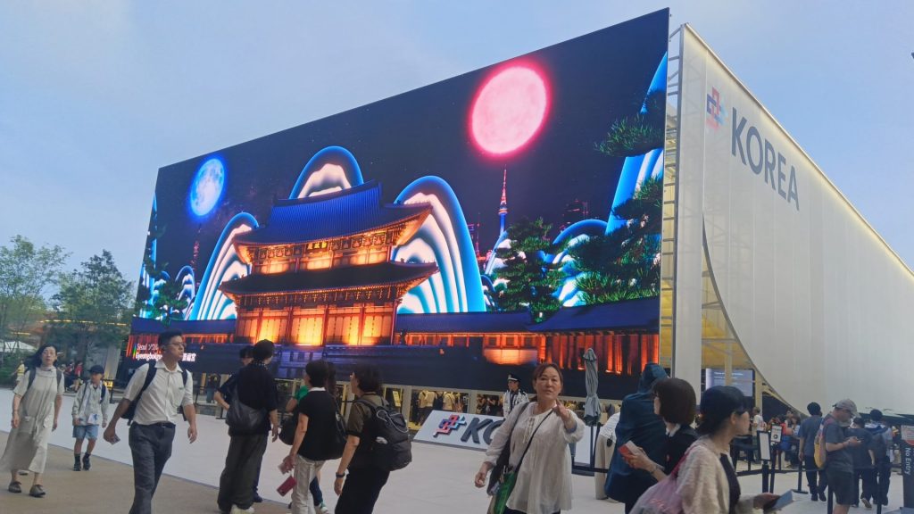 巨大スクリーンに映し出された今昔の韓国の風景に圧倒される。見学者の10代の女性は「パビリオンの中でも大型ビジョンでK-POPを体感できた。これが“没入感”」と満足げ。60代の男性は「“近くて遠い”国。最近は国内政治が安定していないが、この先も親しくなければならない」と話す。