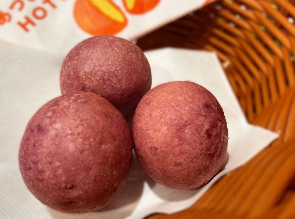 「熱々おさつボール」は、台湾の屋台でおなじみの「QQボール」をモチーフにしたスイーツとのこと。以前、台湾で本場のQQボールを食べたことがあるので、どこまで再現できているのか気になっていました。5個入りもありましたが、今回は3個入りをチョイス。