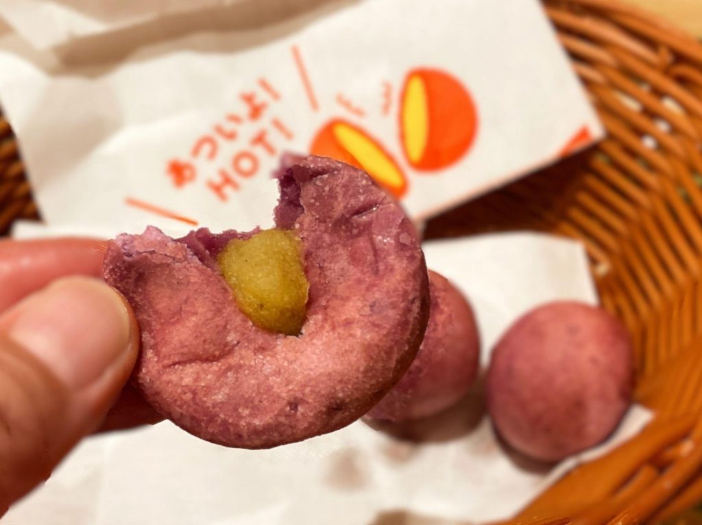 食べてみると、まさに台湾で食べたQQボールそのもの! サクッと揚がった表面と、もっちりした生地のコントラストが絶妙です。中のさつまいもあんは徳島県産「なると金時」を使っているそうで、ホクホクした食感とやさしい甘さがたまりません。