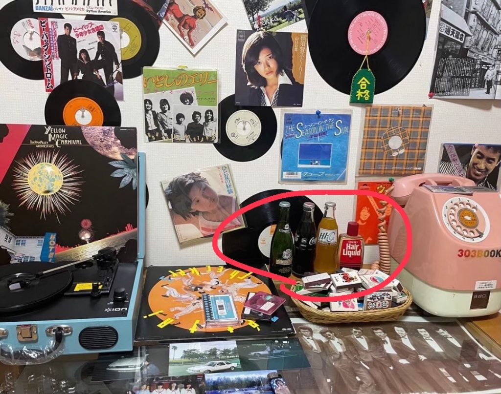 飲み物つながりでもう少し。昭和のジュースは、瓶でも多く売られていました。マリンは、瓶ジュースを集めてインテリアとして飾っているそうで、「未開封の状態のものはなかなか手に入らない」といいます。当然中身は飲めませんが、状態の良いものだと小さな瓶1本5000円で程度で売られているのだとか。