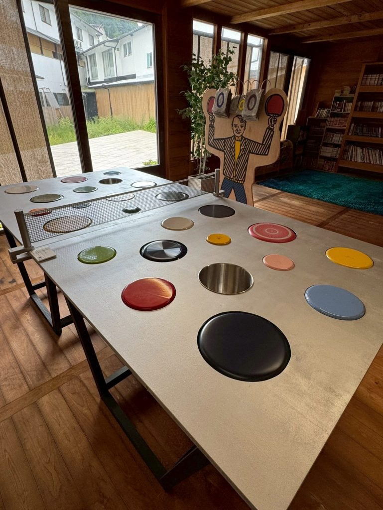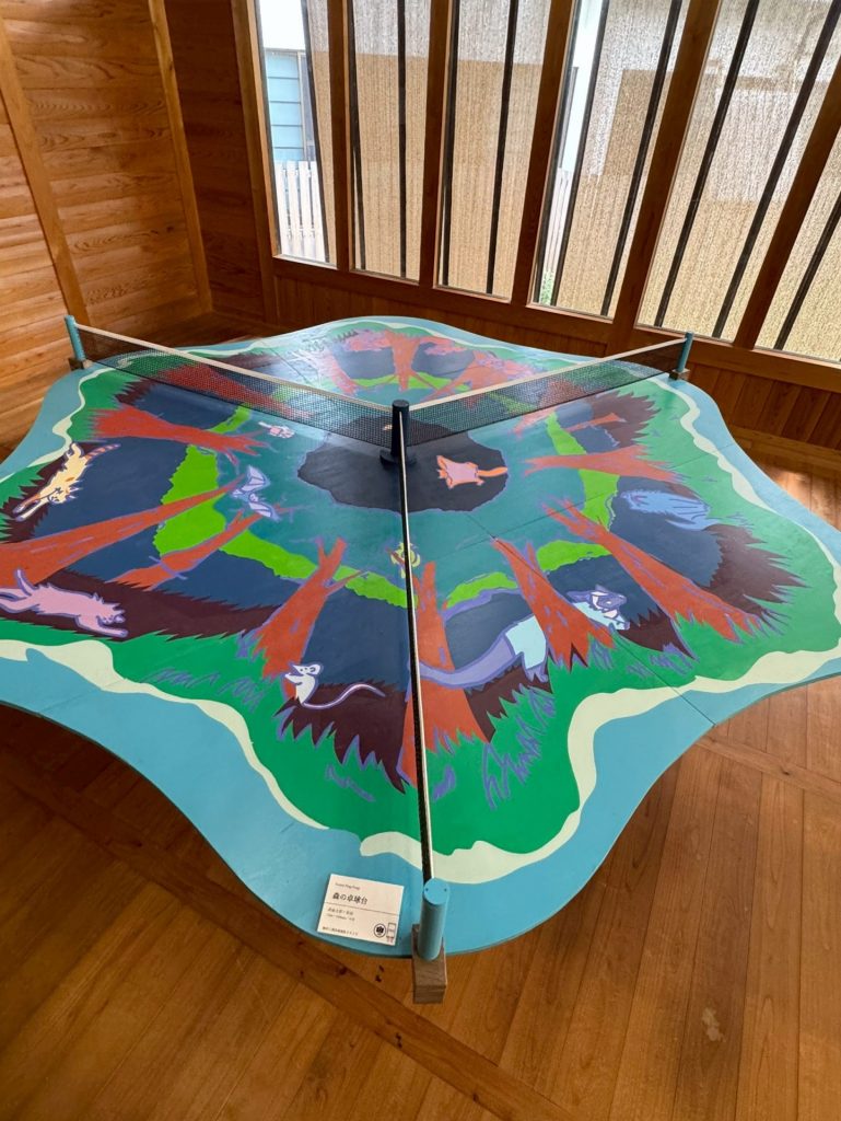 奥の部屋には、温泉宿ではおなじみの卓球台をテーマにした、インスタレーション作家の原倫太郎さんと画家の原游さんによるアーティスト・ユニットの体験型の作品が置かれています。3人で楽しめるポップなイラストが描かれた卓球台や、台にフライパンを埋め込んでいてピンポン玉が当たると音が鳴る卓球台で、3人のうち岩見さんとサマンサさんは汗だくになって遊んでいました。