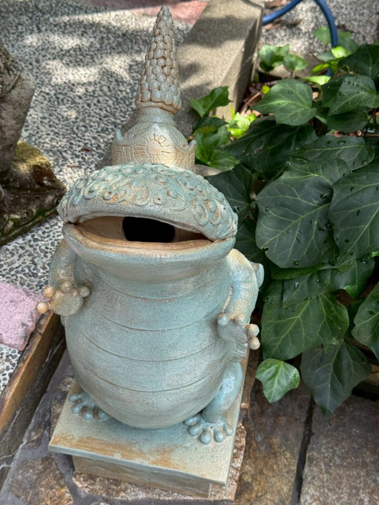 松岡さんの作品は、湯原にあるバリスタイルの温泉宿「我無らん」の軒先にもあります。神社の狛犬ならぬ、「狛はんざき」風の作品で、お宿に合わせてバリ風な作品になっていました。