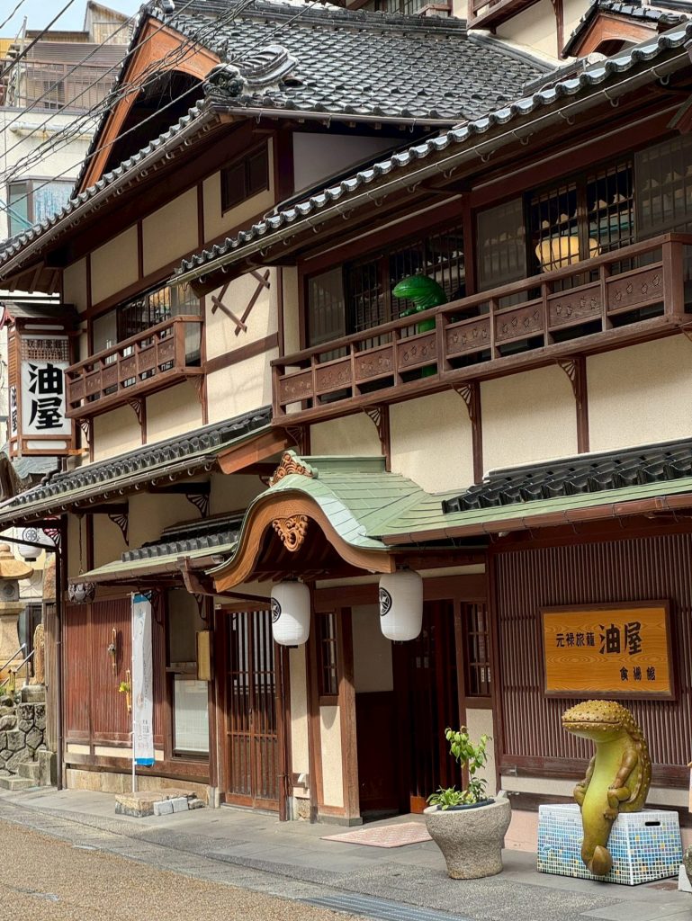 油屋の軒先には彫刻家(美術家)・松岡徹さんの大きなオオサンショウウオ=「はんざき」の作品を発見! 小さな「はんざき」の椅子など“きもかわいい”作品がお宿の雰囲気にピッタリで、3人も映えスポットに興味津々でした。見上げると窓からも「はんざき」が顔を出す姿がありましたが、これは夜に見るとちょっとびっくりするかもしれません……。