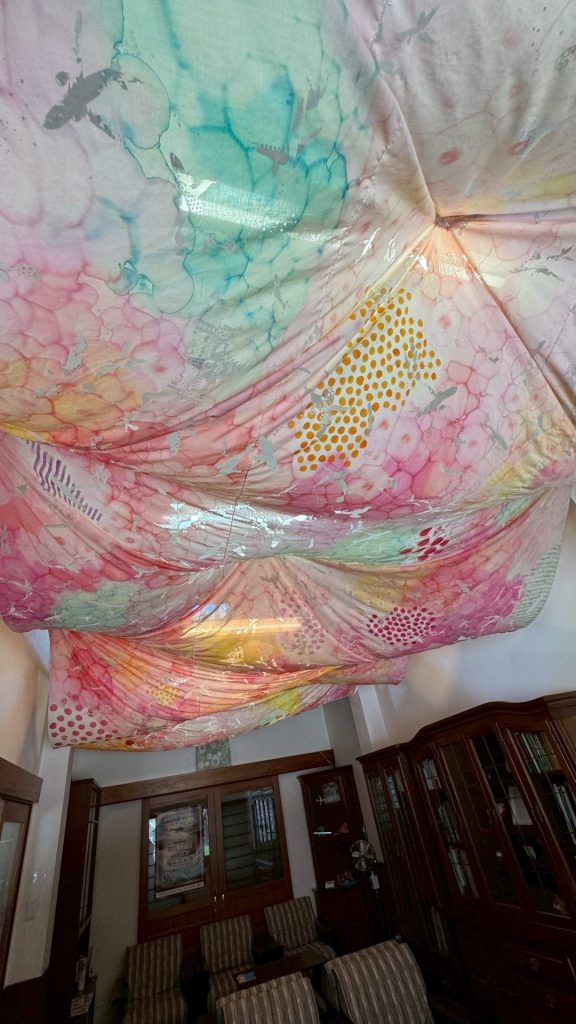 3軒目は、白壁と格子窓、なまこ壁で宿場町の雰囲気を感じさせる「ゆばらの宿 米屋」へ移動。ここには染色作家・テキスタイルアーティストの樫尾聡美さんの作品が展示されています。同館では過去3度の「美作三湯芸術温度」を含めて、樫尾さんの「細胞」をモチーフにしたアートが新旧多数、観ることができます。