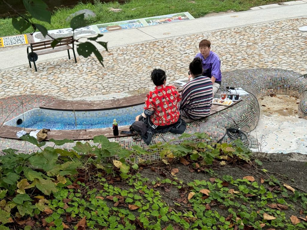 湯原の各地を巡り、多くのアートを堪能した後は、湯原温泉街のつづみ橋のたもとにある「手湯足湯」でひと息。手と足を入れると、少し熱めのお湯ながらすぐに慣れて心地いい温度に。「手をつけるすべすべになる!」と石原さんも笑顔。無色透明、無味無臭のため、見た目に特徴がわかりにくい湯原温泉ですが、入ればその良さが実感できます。