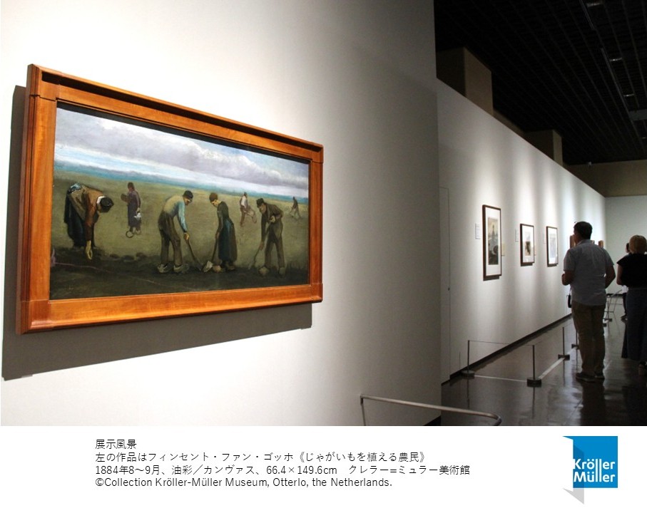 本展は5章構成。ゴッホ作品の展示は、絵の道を志し、親族の画家に指導を受けて仕上げた「麦わら帽子のある静物」(1881年)から始まる。オランダにいたころの初期作品の中で印象的なのは、織工や農民など、働く人々の姿を描いたシリーズだ。中でも「じゃがいもを植える農民」(1884年)は、7人の人物が農作業に励む様子を捉えた、横長の大きなキャンバスが目を引く。ある者はスコップで土を耕し、ある者は種を蒔きと、人物みなが懸命に仕事に勤しんでいる。人々が生きるために行い続けてきた地道な農作業、その営みの尊さに打たれた画家の思いが伝わる秀作だ。