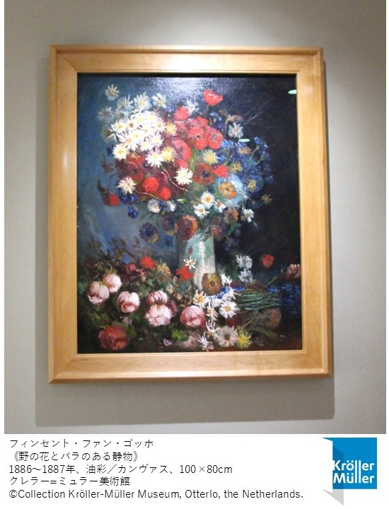 ゴッホは1886年、フランス・パリに拠点を移す。パリで印象派の画家たちの影響を受けて配色や筆致の試行を重ね、それまで暗く重たかった画面は軽やかで明るい色調へと変わっていく。花を主題とした静物画「バラとシャクヤク」(1886年)、「野の花とバラのある静物」(1886~1887年)、「青い花瓶の花」(1887年)はその変化がよく分かる3作。とりわけ「青い花瓶―」は、黄色い小ぶりなヒマワリを中心に白いヒナギク、青いライラック、朱色のアネモネがコバルトブルーの花瓶の上で鮮やかに咲き、背景には新印象派を思わせる点描表現も。オランダ時代と同一作家の手によるものとは思えないほど異なる作風となっている。