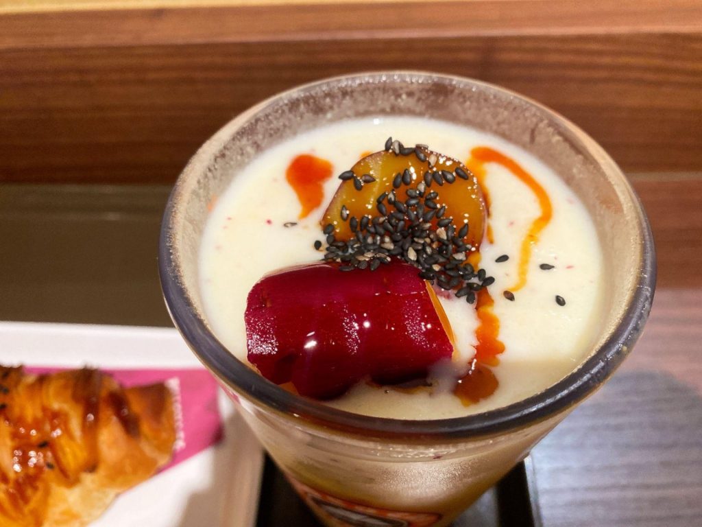 トップにのったさつまいもの甘露煮は、ほっくりとした食感で存在感たっぷり。甘露煮のやさしい甘さが、スムージーとは違った角度からさつまいもの魅力を伝えてくれました。