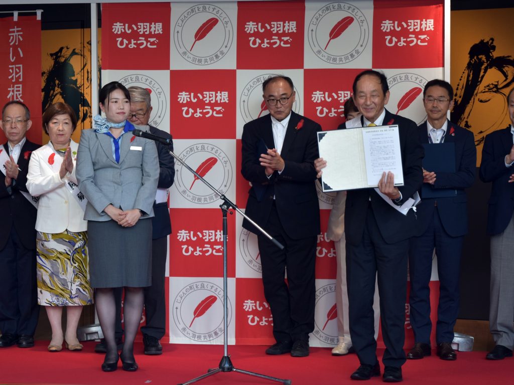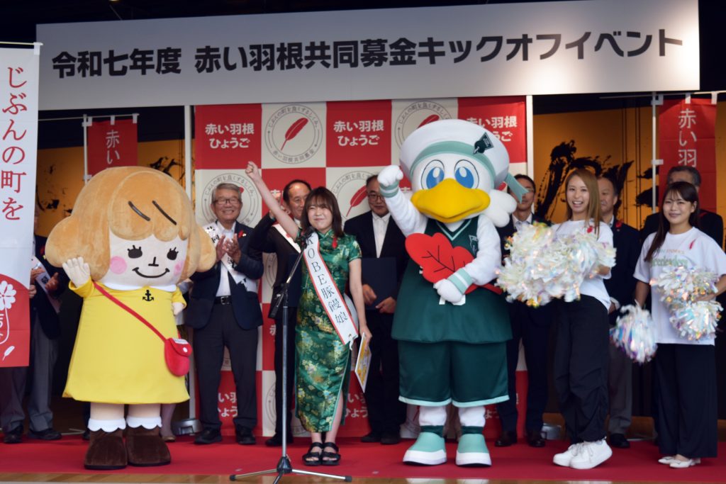 また、地元を代表して第13代「KOBE豚饅娘」の鷲見保乃香さんが「自分たちの住む街をよくする仕組みとして、困っている人たちを支える福祉活動を応援する、赤い羽根共同募金運動にご協力ください。皆さま一緒に頑張りましょう!」と、募金運動の開始を宣言しました。