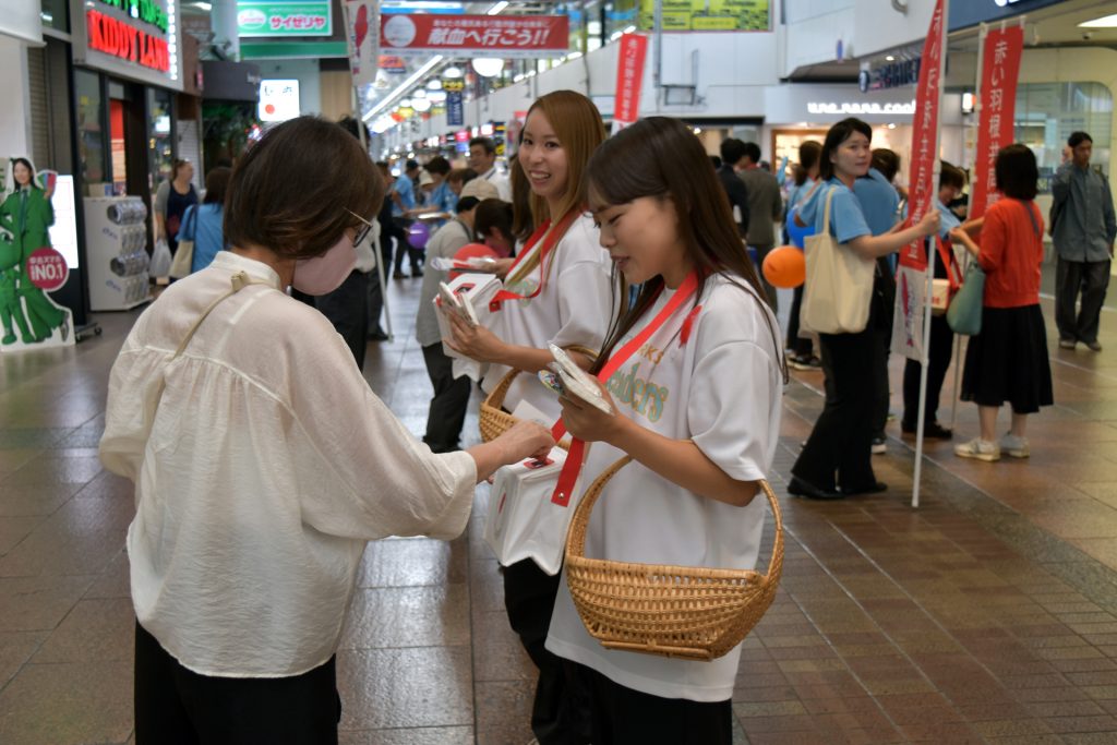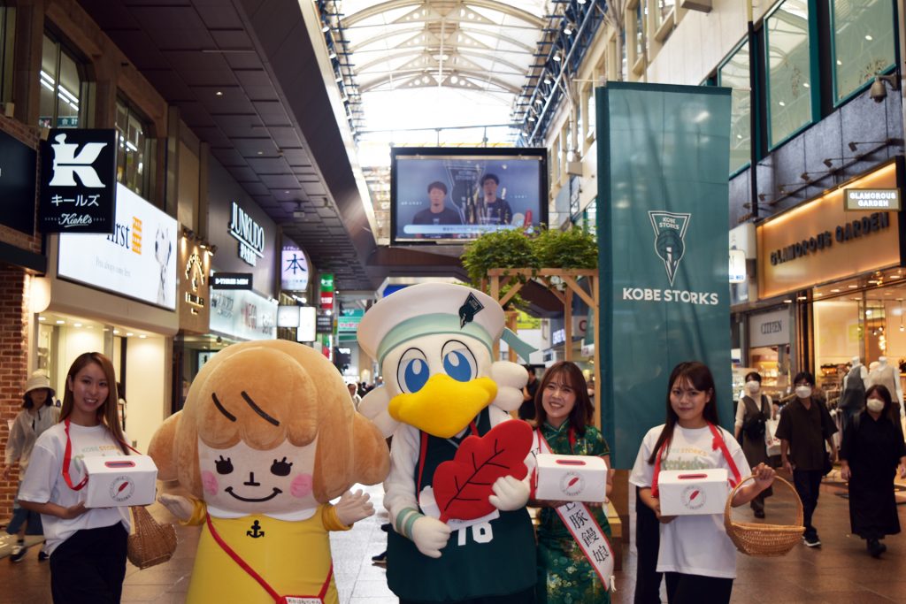 イベントには、「ひょうご赤い羽根サポーター」に就任したプロバスケットボール・Bリーグの神戸ストークスから、マスコットキャラクター「ストーキー」やストークスチアリーダーズも登場。その後に三宮センター街で行われた募金活動では、中央区内のボランティアらとともに街頭に立って募金への参加を呼び掛けました。