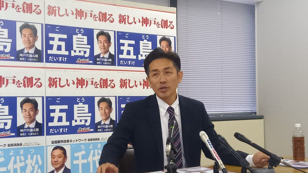 「子育てしたい神戸」「タワマン規制、継続」神戸市長選挙 元市議・五島大亮氏、公約発表 2025/10/08 (写真3枚) 任期満了に伴う神戸市長選挙(10月12日告示・26日投開票)に無所属で出馬を表明している元神戸市議・五島大亮氏(48)が10月3日、公約を発表した。 記事全文を読む 関連記事 「100の政策、目玉はすべて ブレない神戸に」神戸市長選挙 現職・久元喜造氏公約発表 2025/10/02 神戸市長選挙 五島大亮市議、出馬表明「市政の方針転換、人を増やす神戸に」 2025/06/16 久元喜造・神戸市長、4選目指し出馬表明「国際化への可能性、神戸のステージ上げる」 2025/06/11 神戸市長選に立候補の木島氏が公約発表 水道料金4か月無償化、電気料金値下げ、タワマン規制撤廃など 2025/09/05 【神戸】三宮が新しく! 区役所・図書館移転 東遊園地や駅前も再整備 アトア近くに1万人規模アリーナも 2022/07/11